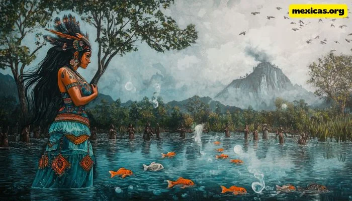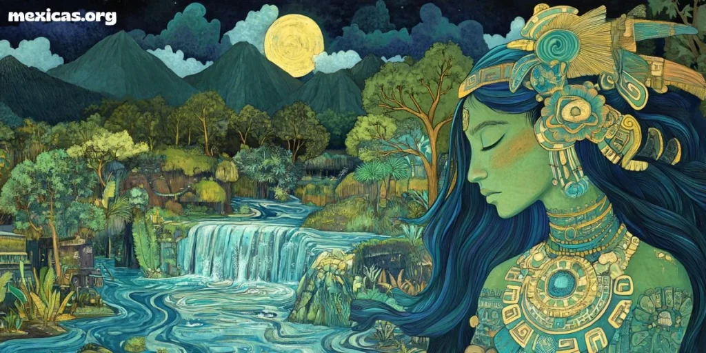 Para los aztecas, Chalchiuhtlicue era la diosa del agua que encarnaba la belleza y el ardor de la juventud. Se la representaba como un río del que crecía un nopal cargado de frutos, simbolizando el corazón humano.